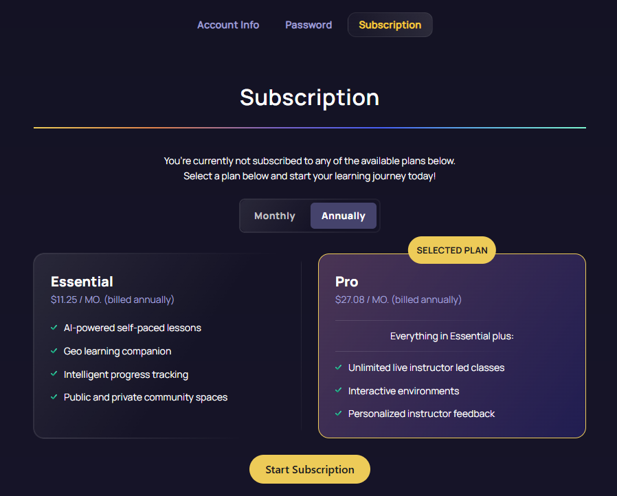 Upon creating an IMMERSE account with your email and password, you will be subscribed. To gain access to the IMMERSE platform, you'll need to initiate a subscription. This either happens during the account creation process or afterwards. IMMERSE provides provides two tier options at monthly or yearly billing intervals, tailored to your learning requirements. New members are eligible for a 14-day free trial, allowing them to explore the platform before committing to a subscription.
