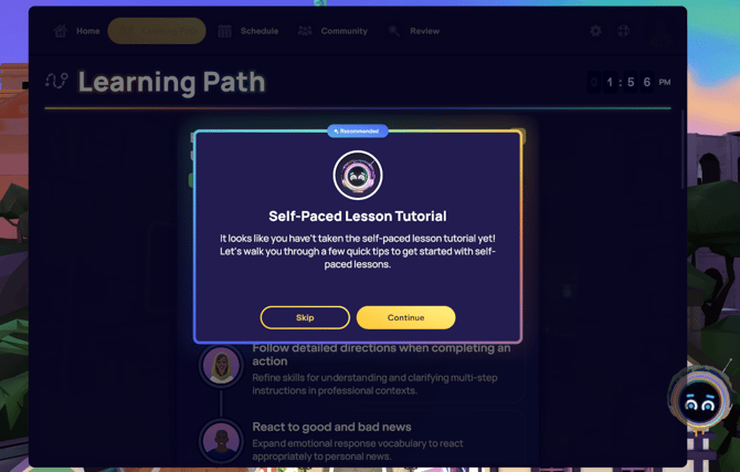 The first time you start a self-paced lesson, you'll have the choice to either take a tutorial to learn how it works or skip it and begin the lesson immediately. This option only appears if you haven't completed a self-paced lesson before. It covers all the Navigation Controls you’ll need to know to progress through the lesson.