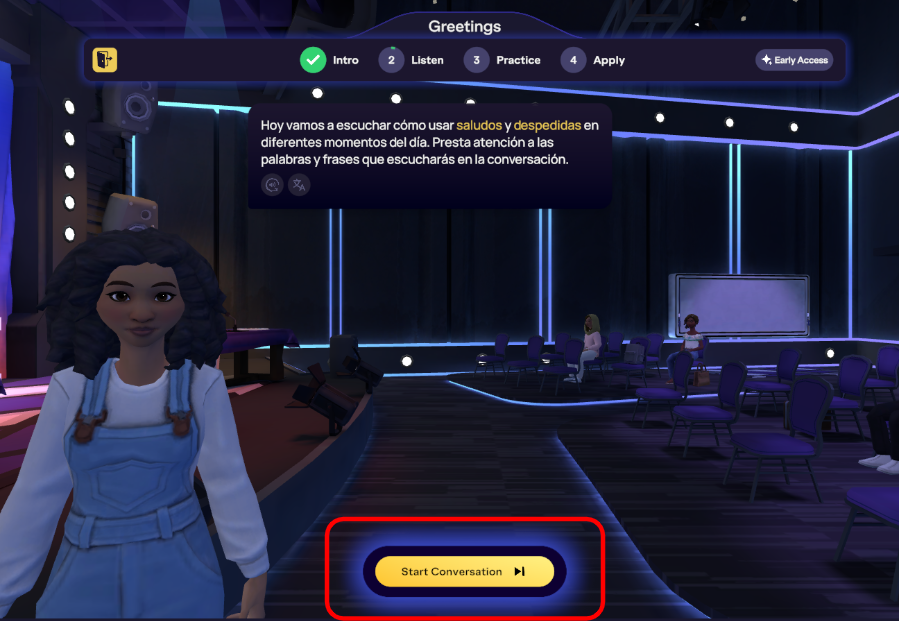 Self-Paced lessons are pre-programmed with a specific avatar and scene to support the lesson content, and learners cannot change these settings. For practice in different spaces with your choice of avatar, explore our Community Scenes.