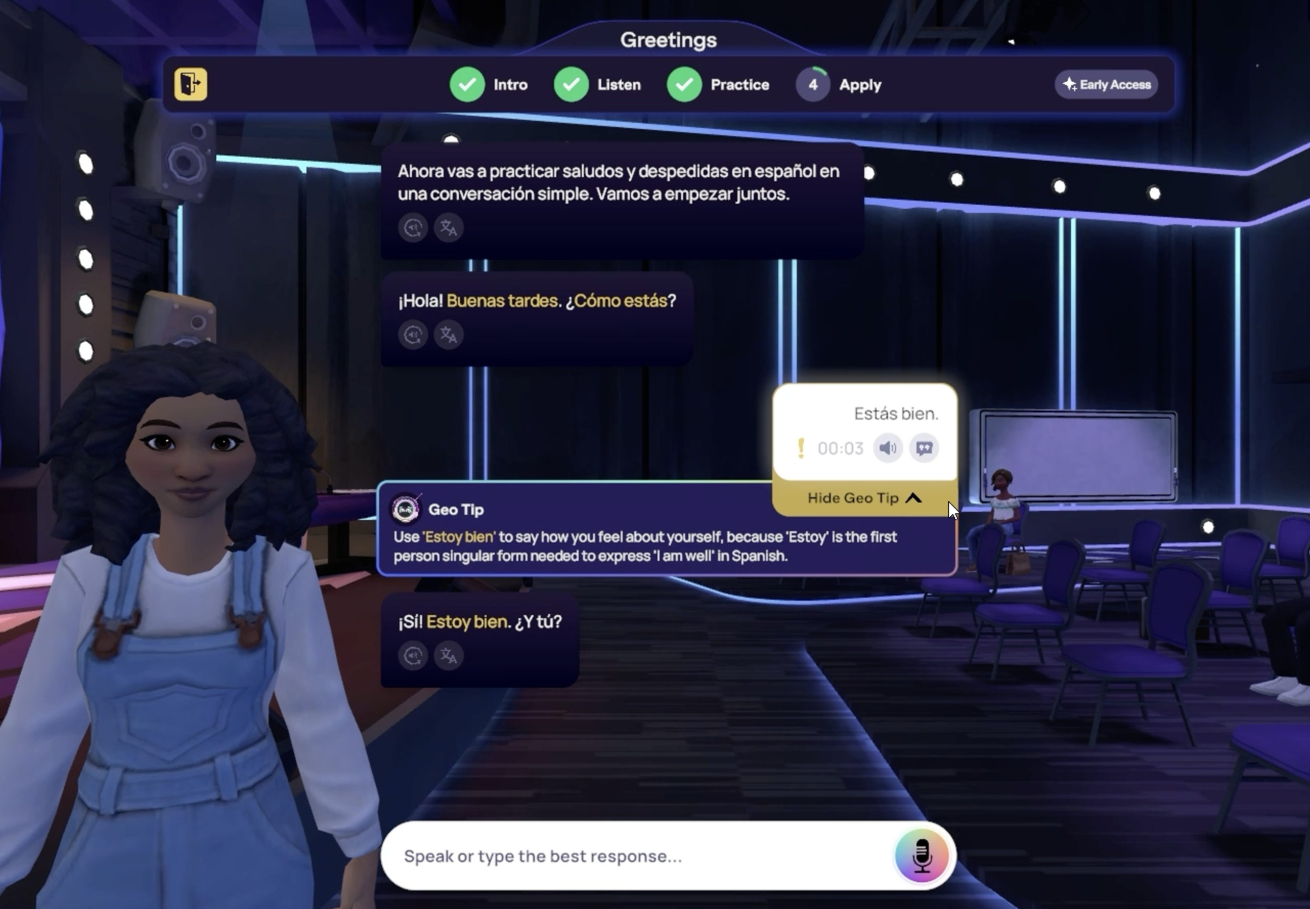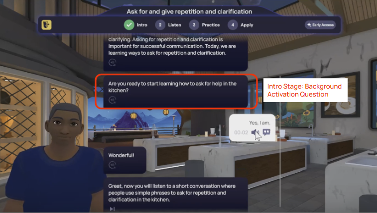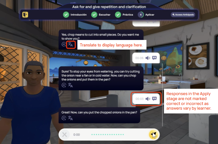 Think of the Apply section as your chance to really use what you've learned in a fun, practice conversation. It’s like the free-talking part of our Live Classes, where you get to chat about real-life stuff based on what you just studied. The goal is to show that you can not just understand, but actually speak the language by acting out different situations. Because of this, you’ll only be able to provide verbal responses using the microphone during the activity.