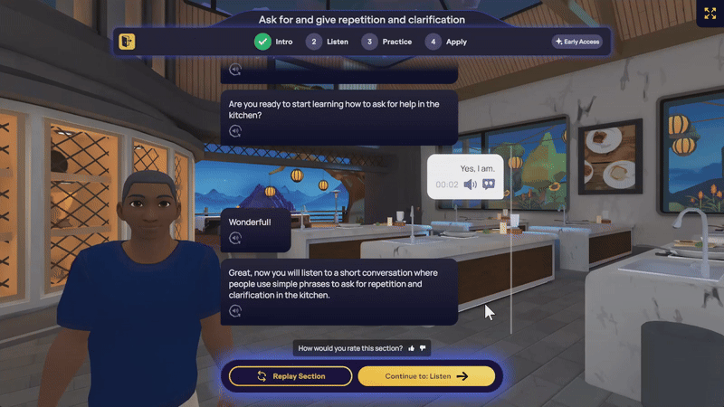 Each lesson begins by demonstrating new concepts through realistic avatar conversations, which are then broken down with guided instruction and hands-on practice. To complete the module, you will apply your new knowledge in a roleplay scenario with an avatar, receiving instant, AI-driven feedback that is precisely aligned with the lesson's communicative goal. This entire process allows you to revisit and practice the material as often as needed to achieve mastery.