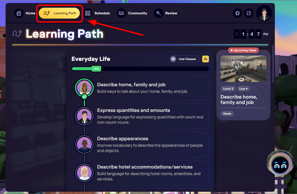 Click on Learning Path at the top (Computer or Mobile) or bottom (VR) of the screen.