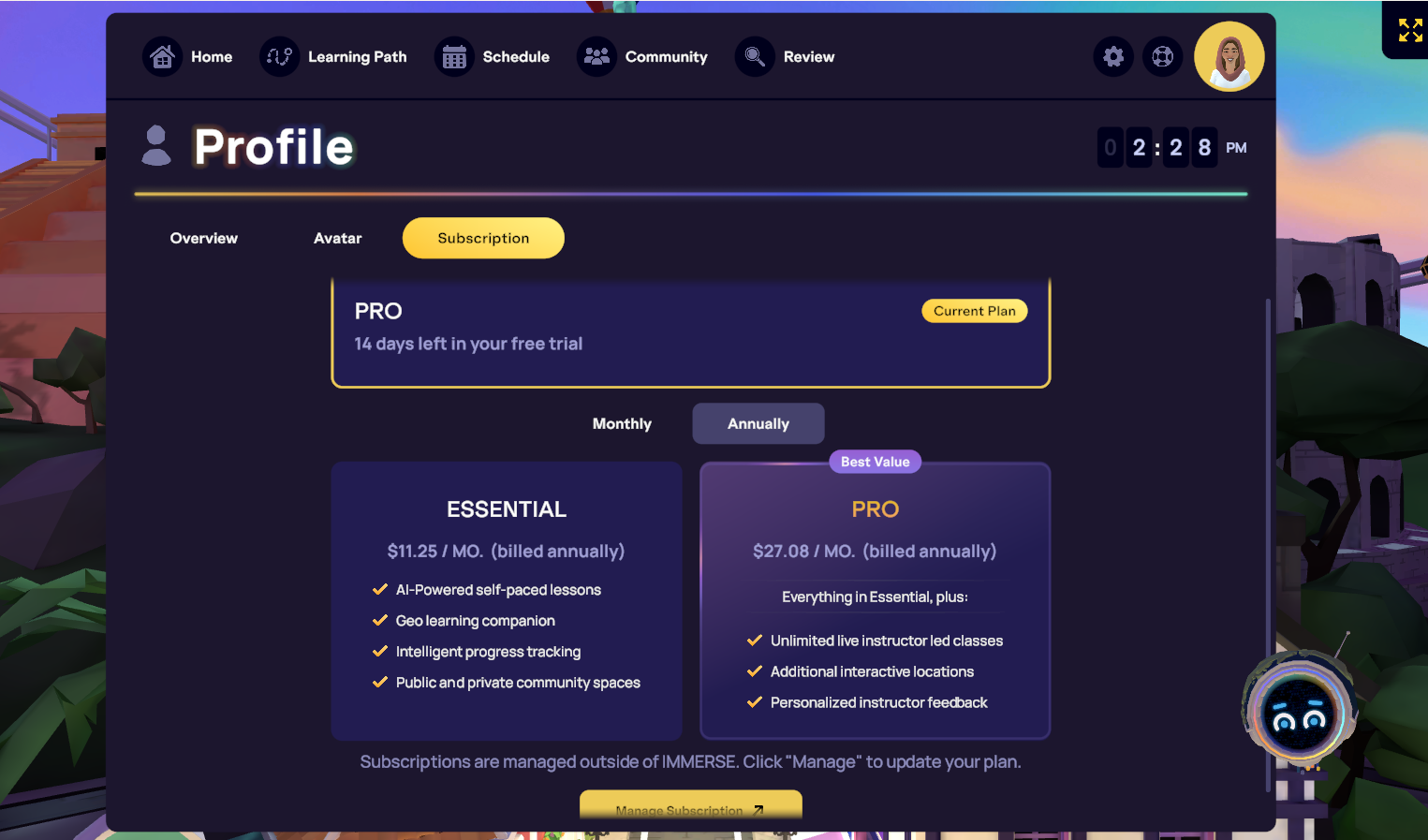 Upon the conclusion of your free trial or paid subscription, access to all IMMERSE features will be restricted. While you can still log into the IMMERSE app, you will encounter a prompt to select a subscription plan to view your Homeroom.