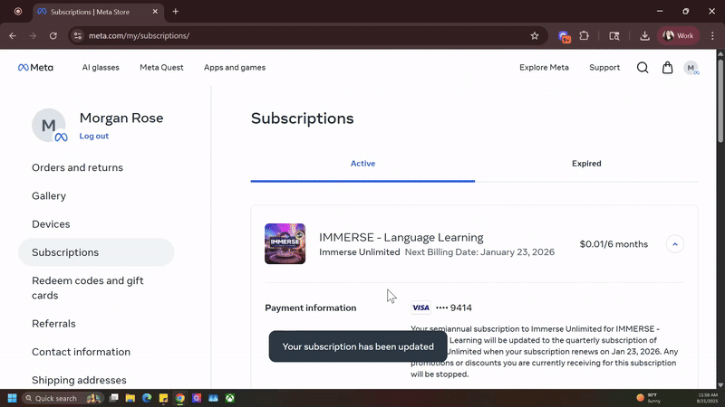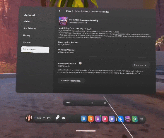 ⚠️ You cannot complete cancellation from within the IMMERSE VR app for Meta Subscriptions.