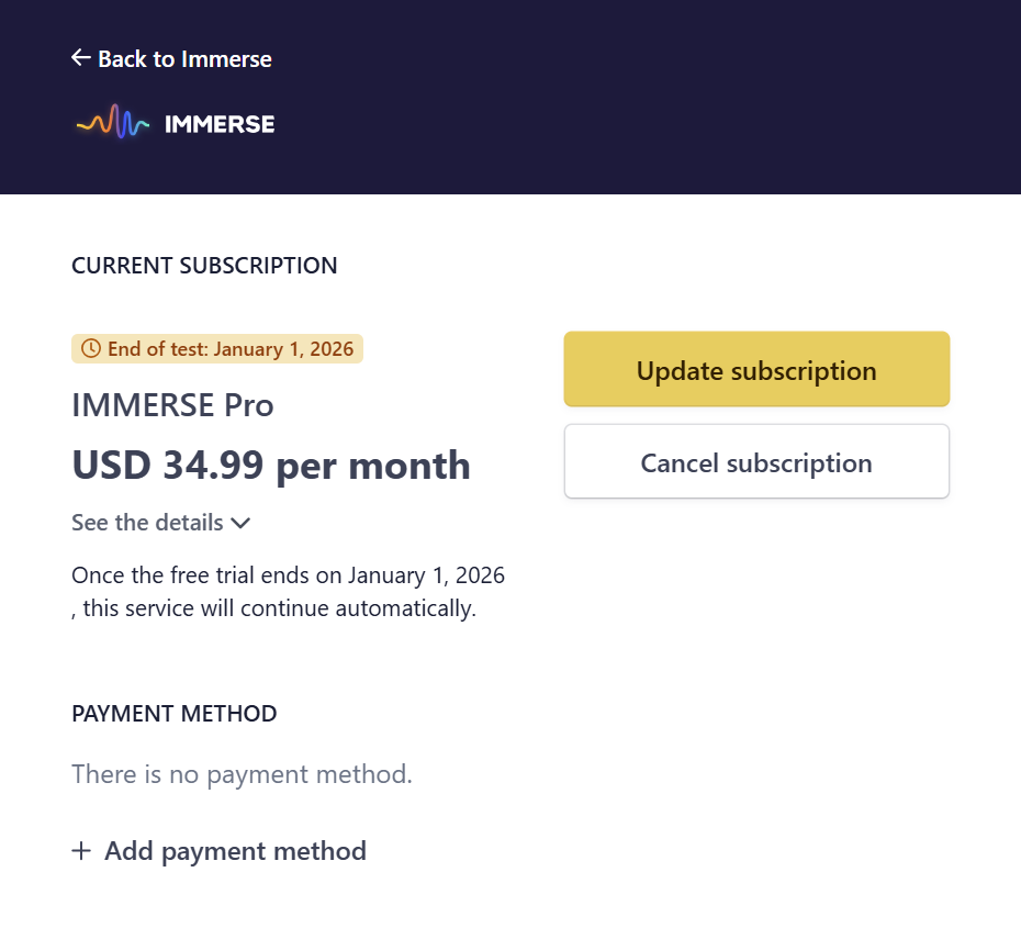 ❓ Billing or Policy Questions? Contact our support team at support@immerse.com for guidance.