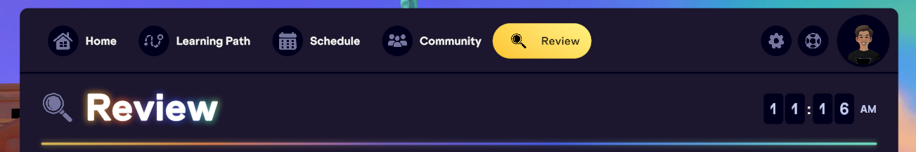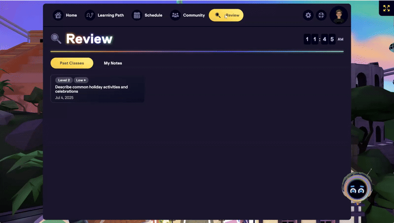All notes from live classes and your personal saved notes are located in your Homeroom's Review tab. To begin reviewing, log in to the IMMERSE VR app or launch IMMERSE from the WebApp.