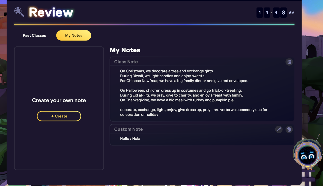 Track your learning progress – Save unfamiliar terms and remove them (by pressing the trashcan icon) once you've memorized them, knowing they will always be accessible in your Past Class Notes.