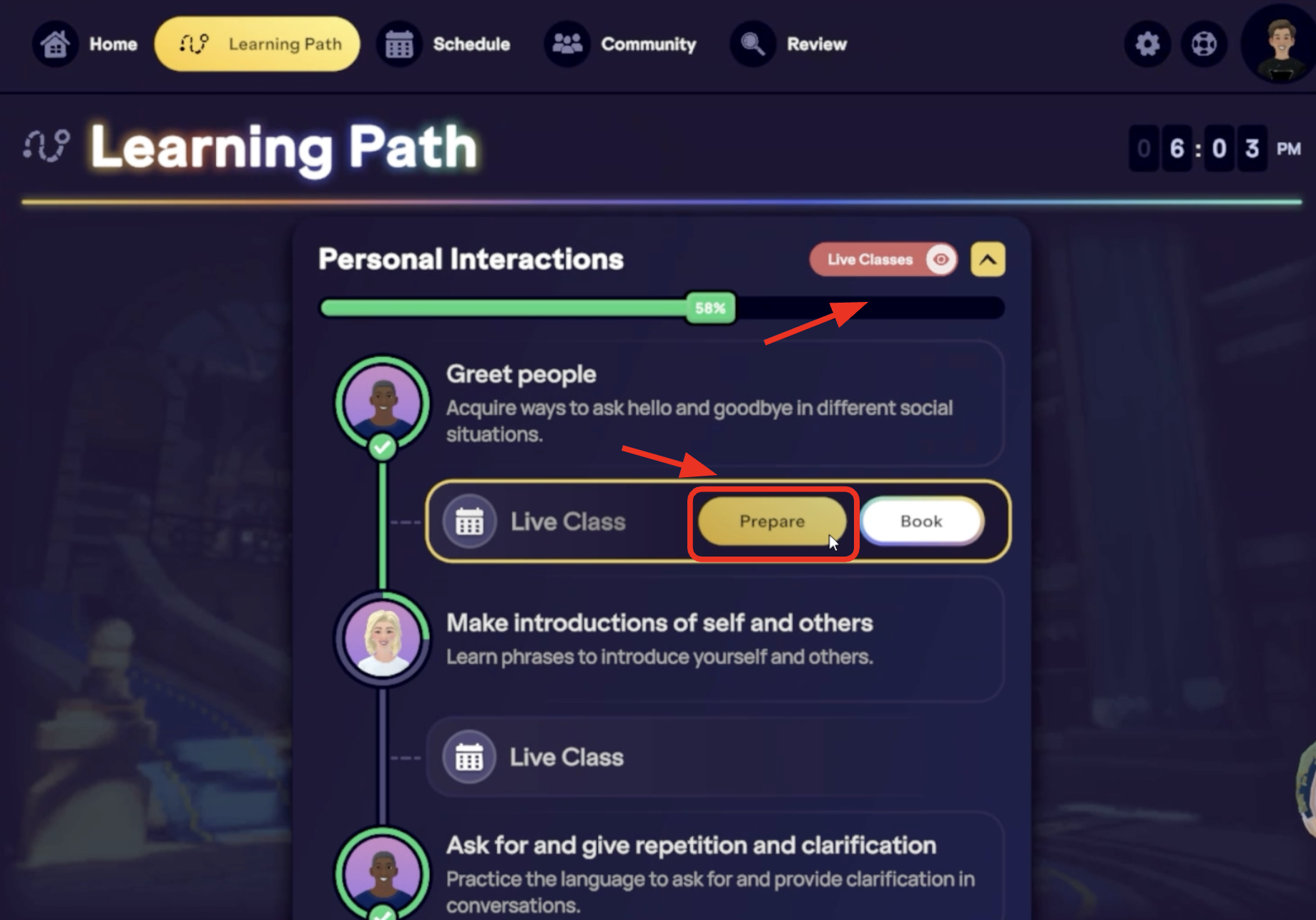Not at all! Completing the associated prep material/practice activities, or the Self-Paced Lesson version is not required to book and attend Live Classes. However, Live Class completion will not contribute to leveling up progress.