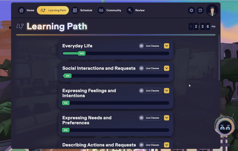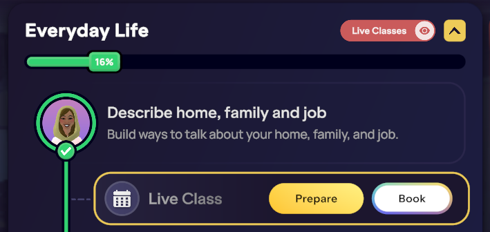 Each section of lessons within a level at IMMERSE is designed around a central theme, and all lessons within that section are independent but connected. This means that while the lessons are related by topic, each one stands on its own and teaches a specific communicative goal. Learners can take them in any order without missing foundational knowledge.