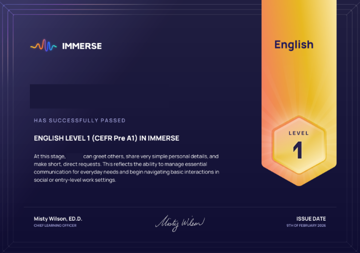 This certificate is officially signed by IMMERSE’s Chief Learning Officer, Misty Wilson, Ed.D, and recognizes the progress you’ve made in your language learning journey.