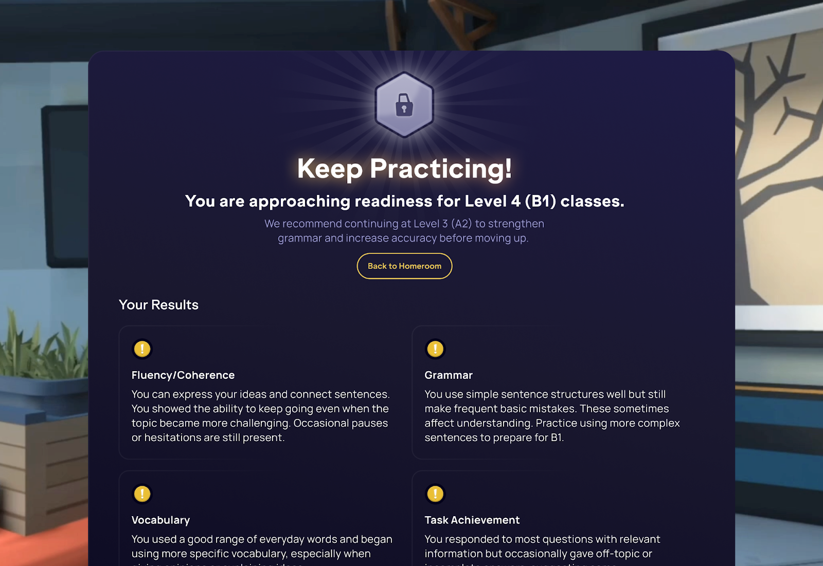 If the assessment determines you’re not quite ready to level up, you’ll be given some recommendations for which areas you can improve in before coming back to try again. You will be prompted to return to your Homeroom.