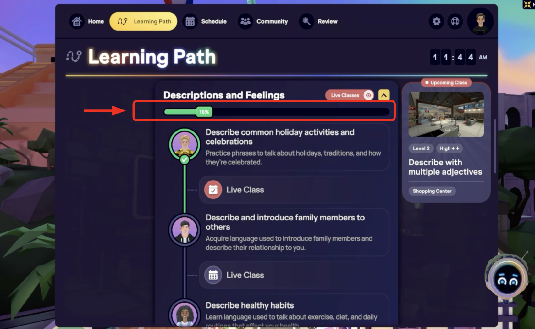 Your Homeroom gives you enhanced visibility into your progress, separating different learning “types” for a clearer understanding of your achievements. You'll see self-paced lessons and live classes displayed individually, giving you a more accurate and motivating view of your growth.