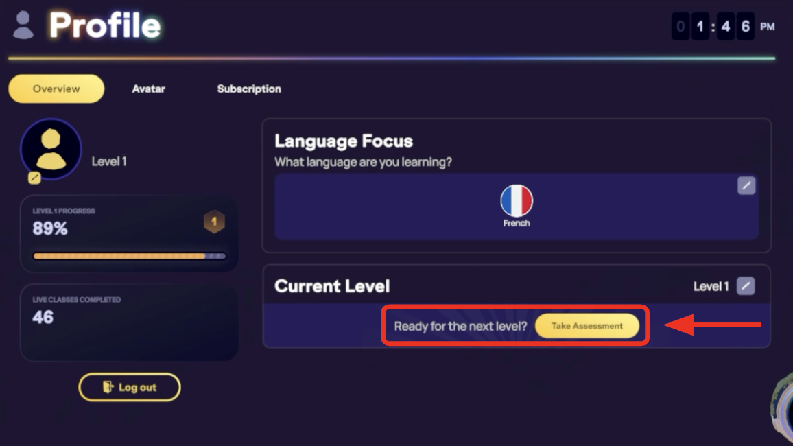 The Level Up Assessment can be found on your profile page at any time but will also be presented to you at the bottom/end of each level.