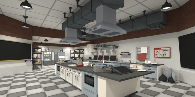 Explora Escuela de Cocina, nuestro nuevo entorno inmersivo para las clases. Es ideal para practicar escenarios cotidianos en un espacio moderno y realista.