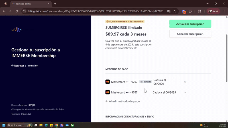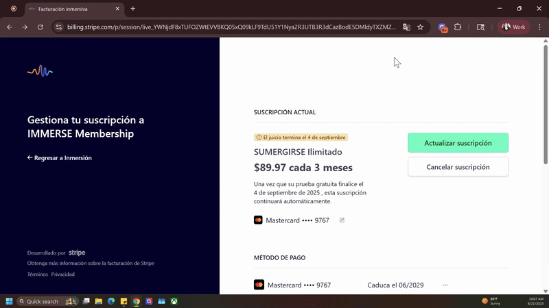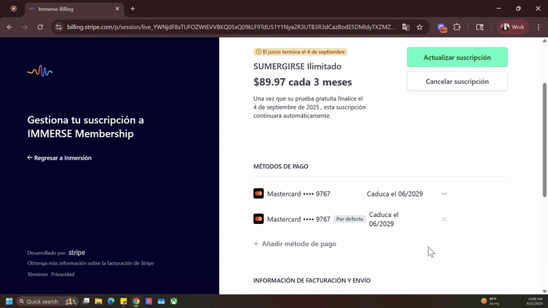 Para hacer cambios en tus métodos de pago, necesitarás acceder a la información de tu suscripción en Stripe a través de tu cuenta de IMMERSE en la aplicación web. Sigue las instrucciones a continuación para acceder a tu Ventana de Pago de Stripe y agregar un método de pago: