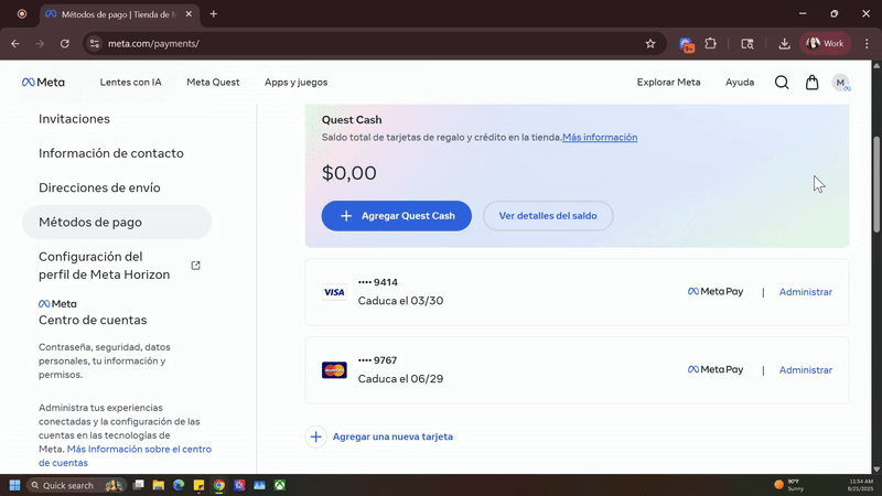 Puedes agregar tarjetas de crédito o débito (American Express, MasterCard, Visa), PayPal o una tarjeta de regalo de la Meta Horizon Store a tu cuenta de Meta.