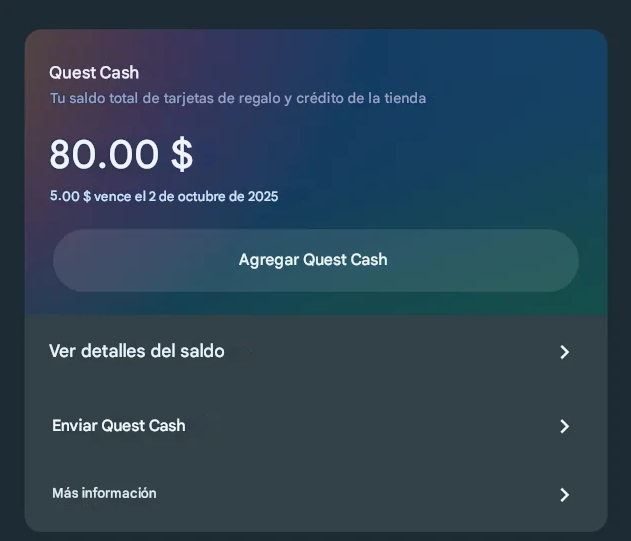 Si el saldo de tu Quest Cash no cubre el total de la compra, el monto restante se cobrará a tu otro método de pago autorizado.