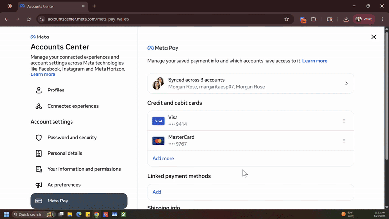 Ve a https://www.meta.com/payments y selecciona Administrar junto al método de pago que deseas eliminar. Esto te llevará al Centro de Cuentas.