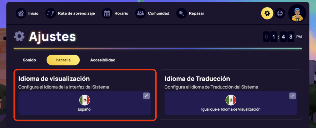 Después de iniciar sesión en la aplicación web de IMMERSE o en el aula principal de IMMERSE, puedes cambiar el idioma de visualización en varios lugares. ¡Incluso en una clase en vivo o en una escena comunitaria! 🎉