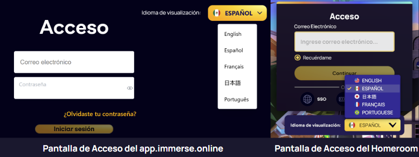 Puedes cambiar el idioma de visualización en las pantallas de inicio de sesión, tanto de la aplicación web como del aula principal. Simplemente selecciona tu idioma preferido en el menú desplegable antes de introducir tus credenciales.