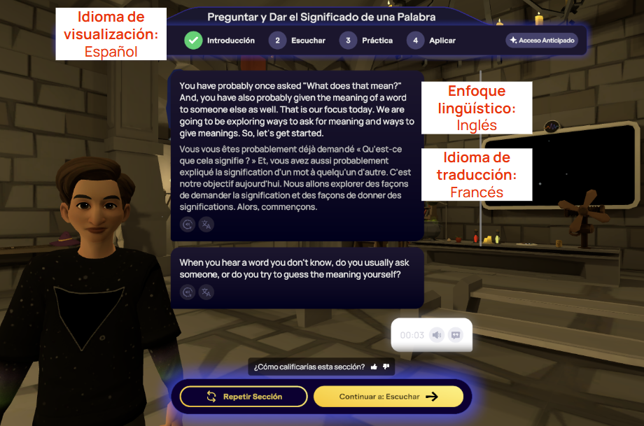 El idioma de traducción del sistema determina el idioma de salida de cualquier traducción dinámica o generada por IA que aparezca en la app IMMERSE. Esto incluye traducciones de texto y respuestas generadas por IA en lecciones a tu propio ritmo, así como los resultados de la función de Asistente de Idioma. Nuestra integración con API de IA generativa de terceros nos permite ofrecer compatibilidad con más idiomas en estas herramientas que los disponibles en nuestras opciones de idioma de visualización estándar.