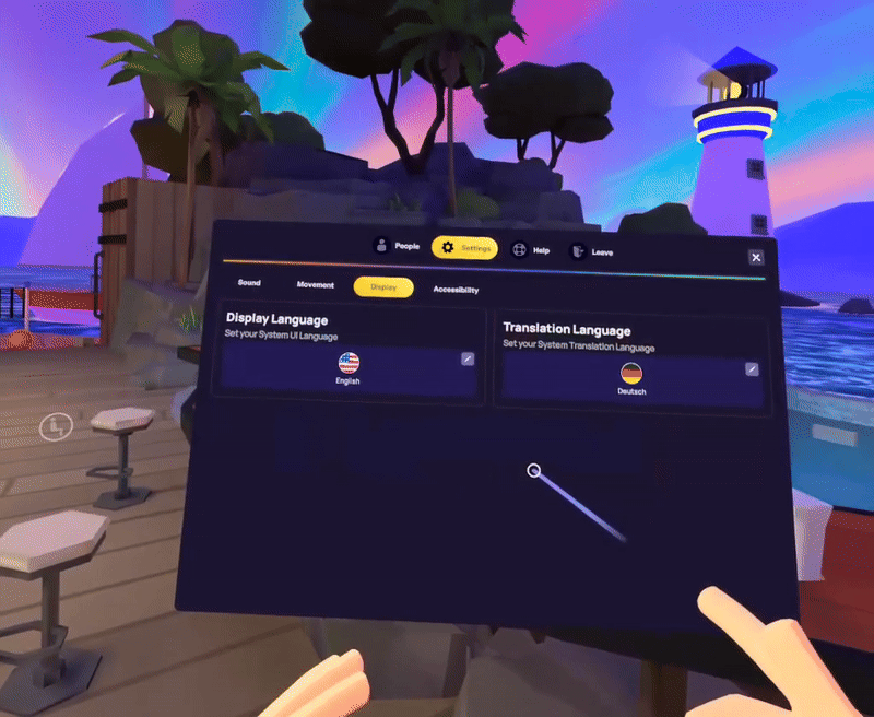Actualmente, tu idioma de traducción predeterminado solo se puede ajustar tras iniciar sesión en el aula de IMMERSE. Puedes hacerlo desde una computadora o en realidad virtual. Una vez iniciada la sesión, puedes cambiar el idioma en el aula, durante una clase en vivo o una escena comunitaria.