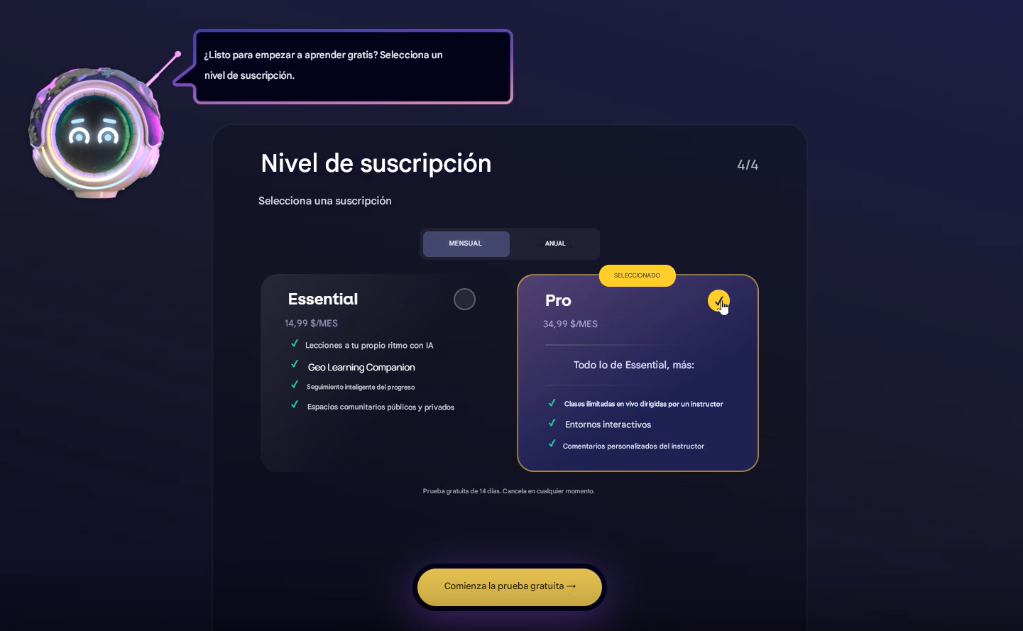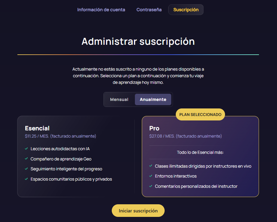 Al crear una cuenta de IMMERSE con tu correo electrónico y contraseña, no tendrás suscripción. Para acceder a la plataforma IMMERSE, deberás iniciar una suscripción. Esto puede ocurrir durante el proceso de creación de la cuenta o posteriormente. IMMERSE ofrece tres periodos de suscripción distintos, adaptados a tus necesidades de aprendizaje. Los nuevos miembros pueden disfrutar de una prueba gratuita de 14 días, que les permite explorar la plataforma antes de suscribirse.