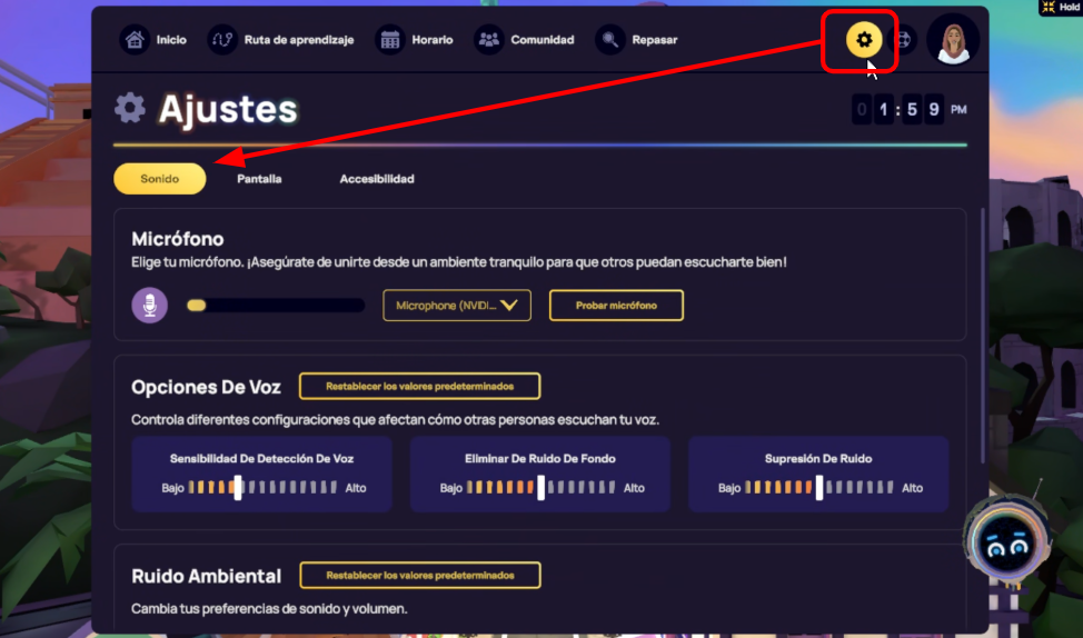 Aprende a ajustar tu configuración de sonido personal dentro de la plataforma para mejorar tu experiencia de aprendizaje.