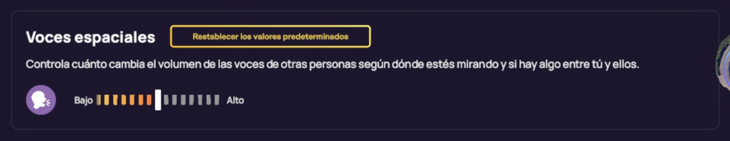 En conjunto, las siguientes configuraciones ayudan a crear una experiencia de audio más clara y enfocada en VR al priorizar su voz sobre otros sonidos.