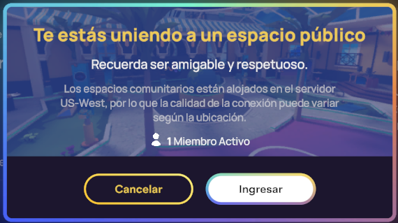 • Tras hacer clic en "Unirse" en la ventana de Intercambio de Idiomas, aparecerá una notificación que te recordará que estás entrando a un espacio público y que debes ser respetuoso. Verás " 👤# Miembro(s) Activo(s) " encima del botón de confirmación "Unirse" si hay otros miembros en el espacio.