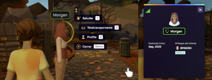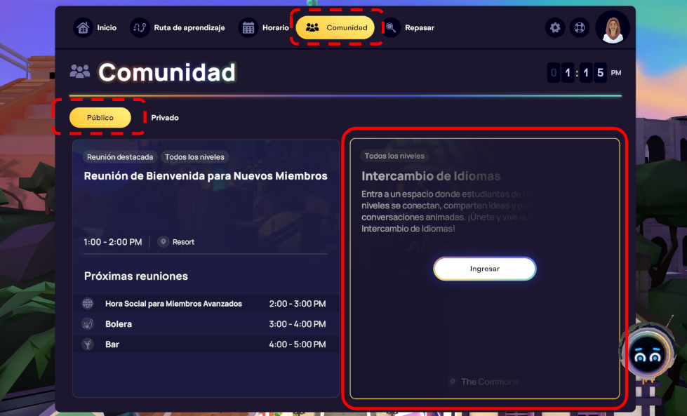 El Espacio de Intercambio de Idiomas está disponible las 24 horas del día, los 7 días de la semana, a través de la pestaña Comunidad en el panel de control del aula principal para los estudiantes qué tengan acceso a escenas públicas en vivo. Este espacio te permite conectar con otros miembros, compartir información sobre tu progreso de aprendizaje, consultar recursos útiles y practicar tus habilidades de conversación entre clases en vivo con hablantes de diversos programas de idiomas.