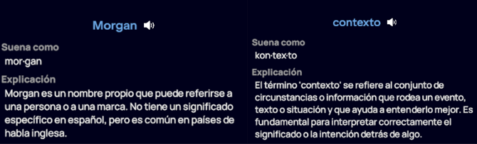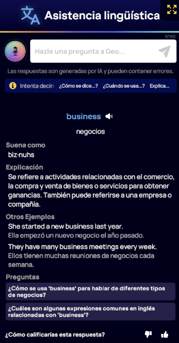 Para contenido asincrónico, puedes hacer clic en cualquier palabra que se vuelva azul al pasar el cursor sobre ella para acceder a su traducción. Además, al hacer clic en el icono de traducción junto a los resultados, se abrirá el Asistente de Idioma , que ofrece más detalles y ejemplos relacionados con la palabra. Esta función está disponible en las siguientes áreas: