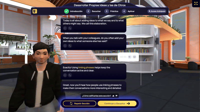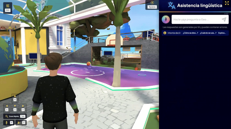 La función de Asistencia Lingüística de IMMERSE está diseñada para ayudarte a comprender y usar nuevo vocabulario, conocimientos culturales y gramática con facilidad. Ya sea en realidad virtual o en el ordenador, esta herramienta ofrece traducciones en tiempo real, ayuda con la pronunciación y consejos de uso, todo al alcance de tu mano.