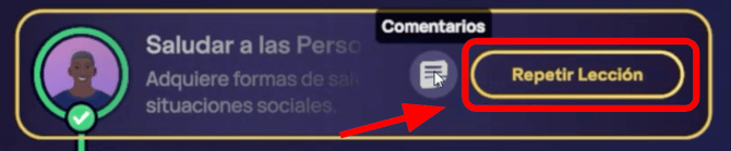 Para reiniciar la Lección Autoguiada con IA y buscar un mejor desempeño y retroalimentación, coloca el cursor sobre la tarjeta y selecciona Repetir Lección.