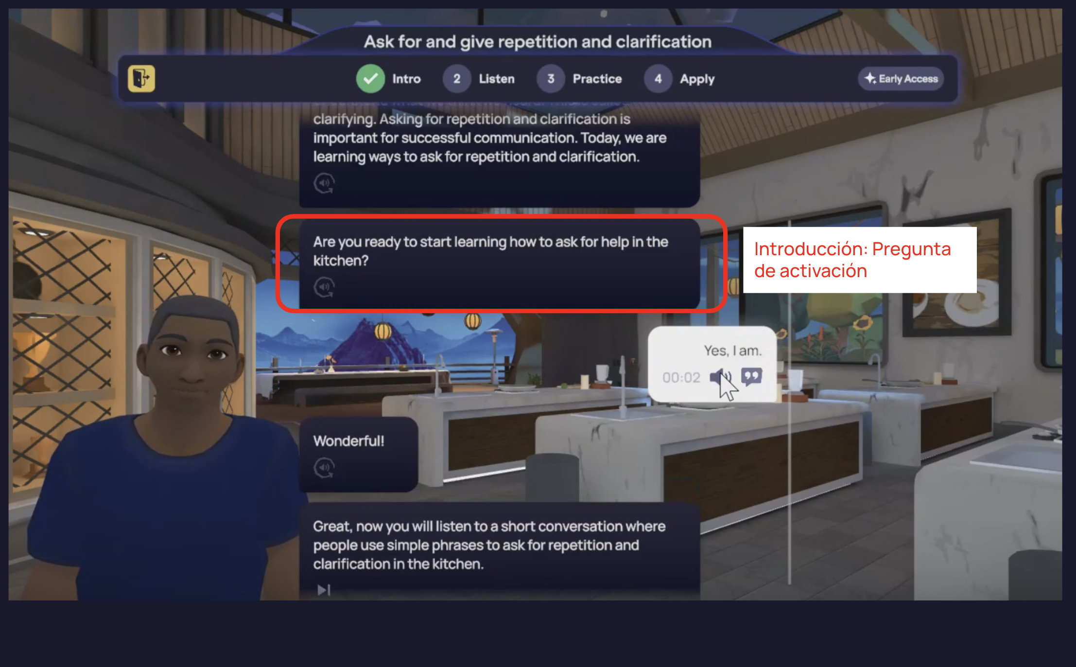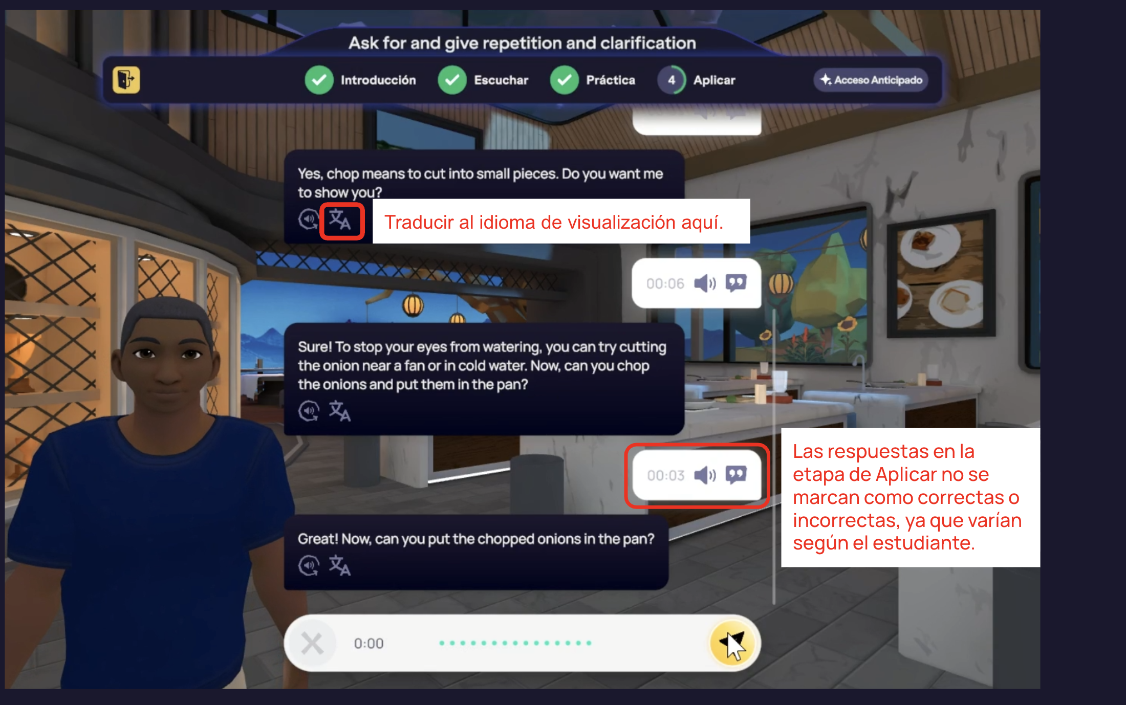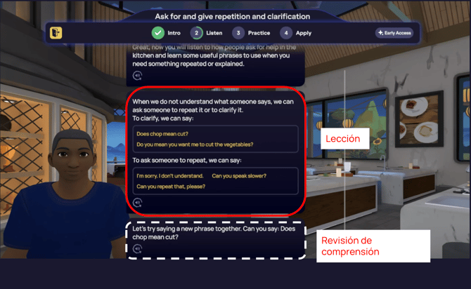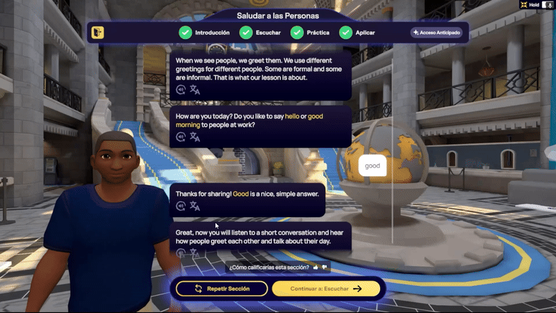 Cada lección comienza demostrando nuevos conceptos a través de conversaciones realistas entre avatares, las cuales se analizan después con instrucción guiada y práctica interactiva. Para completar el módulo, aplicarás tus nuevos conocimientos en un escenario de juego de roles con un avatar, recibiendo retroalimentación instantánea impulsada por IA, alineada de manera precisa con el objetivo comunicativo de la lección. Todo este proceso te permite repasar y practicar el contenido tantas veces como necesites hasta alcanzar la maestría.
