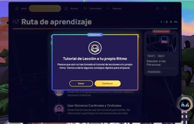 La primera vez que inicies una lección a tu Ritmo, tendrás la opción de tomar un tutorial para aprender cómo funciona o de saltarlo y comenzar la lección de inmediato. Esta opción solo aparece si no has completado ninguna lección autodidacta antes. El tutorial cubre todos los Controles de Navegación que necesitarás conocer para avanzar en la lección.
