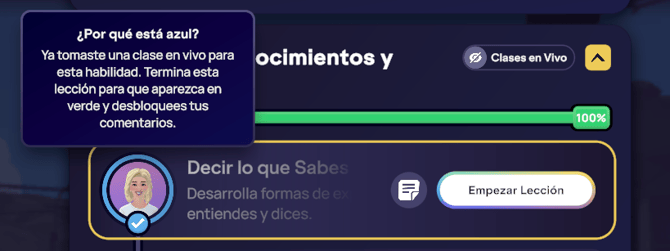 Las clases presenciales completadas después del 30 de junio de 2025 ya no harán que el indicador de "Lección a tu propio ritmo" se vuelva azul. En su lugar, al activar "Clases presenciales" en la Ruta de aprendizaje, estas aparecerán con una marca de verificación roja junto a ellas. Para avanzar de nivel, deberás completar la Lección a tu propio ritmo correspondiente, ya que las clases presenciales tomadas después del 30 de junio de 2025 no contribuyen al progreso de nivel.