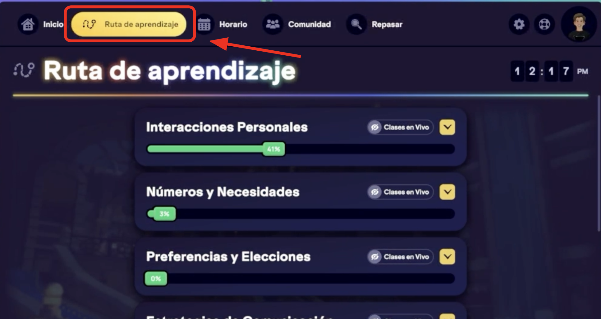 La sección Ruta de Aprendizaje dentro de tu Homeroom te da acceso a todas las Lecciones a tu Ritmo. Está diseñada para ofrecerte un marco claro y adaptable para mejorar tus habilidades en tu nivel actual.
