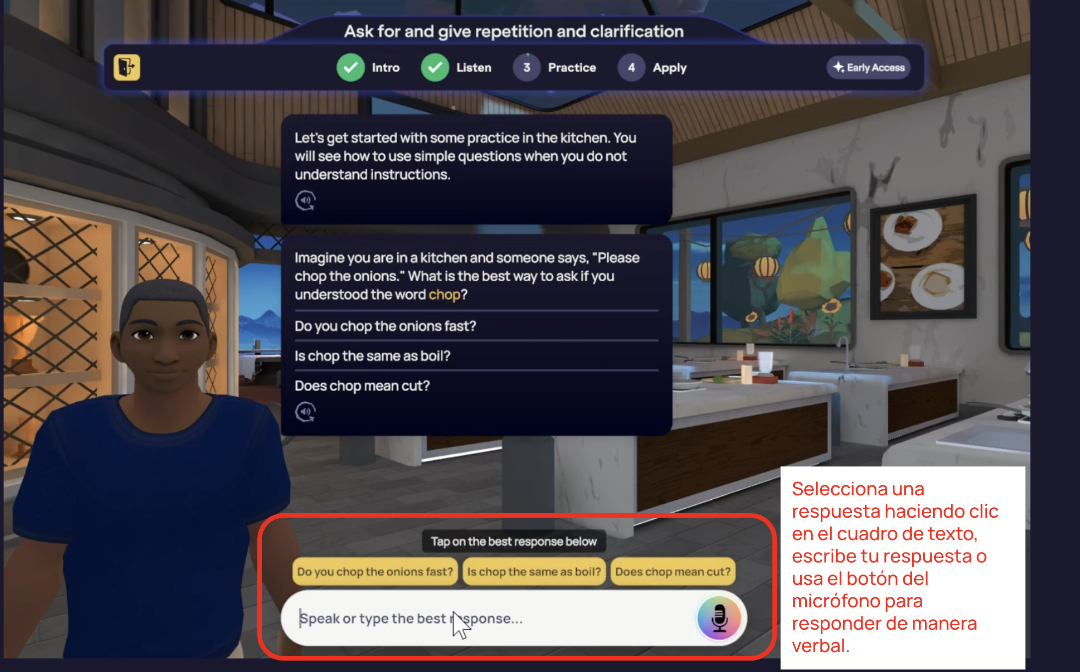 Seleccionar una Opción (Actividades de Práctica): Para actividades de práctica con selecciones, haz clic en la ventana de prueba para elegir una opción en lugar de escribir o hablar.
