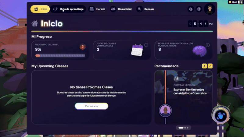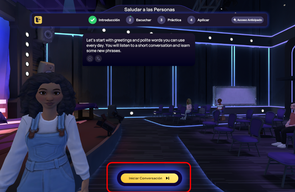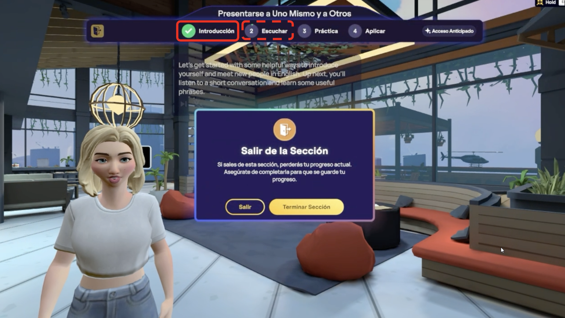 Las Lecciones a tu Ritmo están preprogramadas con un avatar y una escena específicos que apoyan el contenido de la lección, y los estudiantes no pueden cambiar estas configuraciones. Para practicar en diferentes espacios con el avatar de tu elección, explora nuestras Escenas Comunitarias.