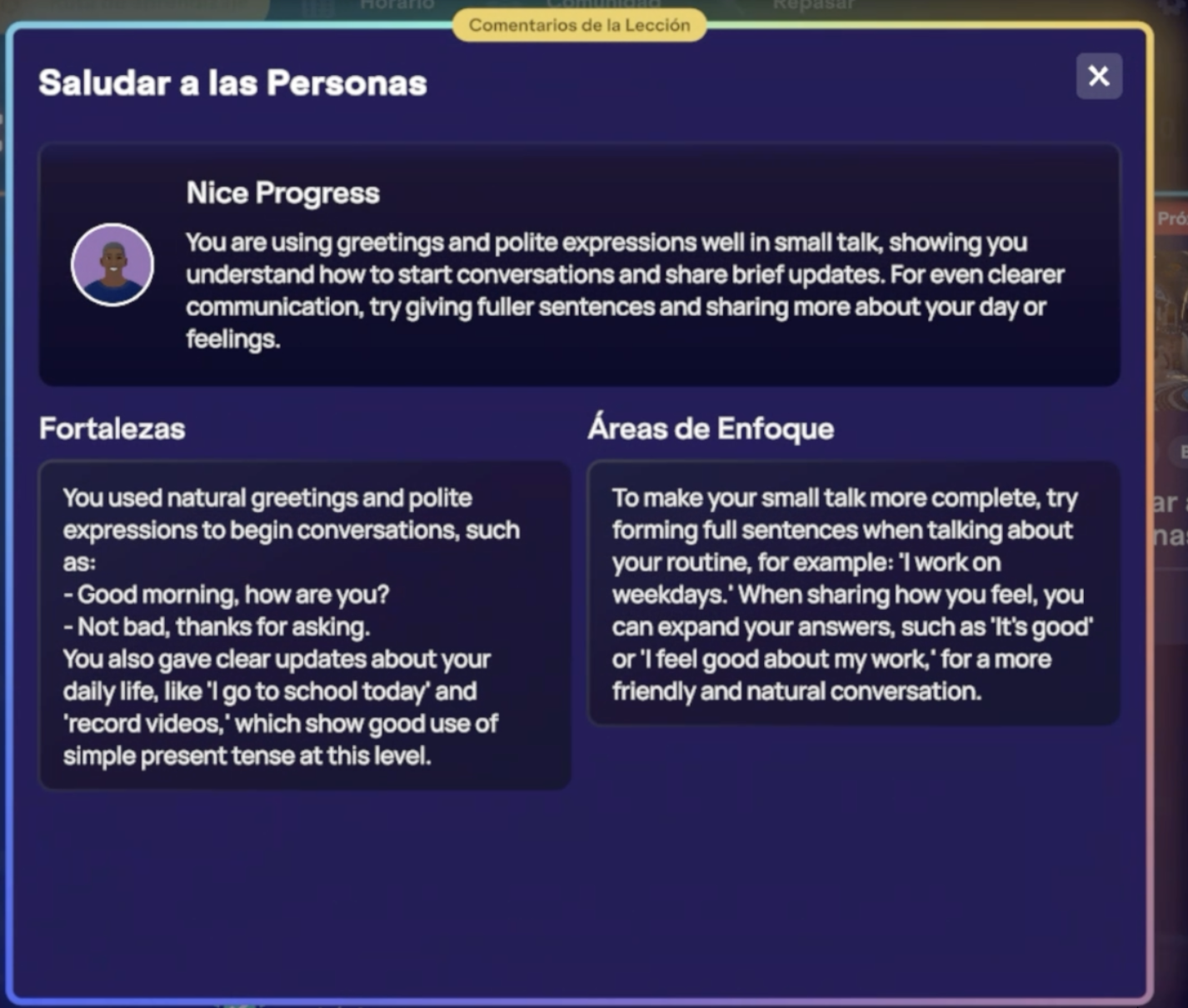 Tu Resumen personalizado ofrece retroalimentación específica y accionable. Destaca tus fortalezas y áreas de mejora utilizando el mismo lenguaje que usaste durante la lección para brindar información significativa. Aquí encontrarás un mensaje alentador del avatar Tutor IA, un desglose de tus Fortalezas y una lista de Áreas de Enfoque para seguir mejorando.