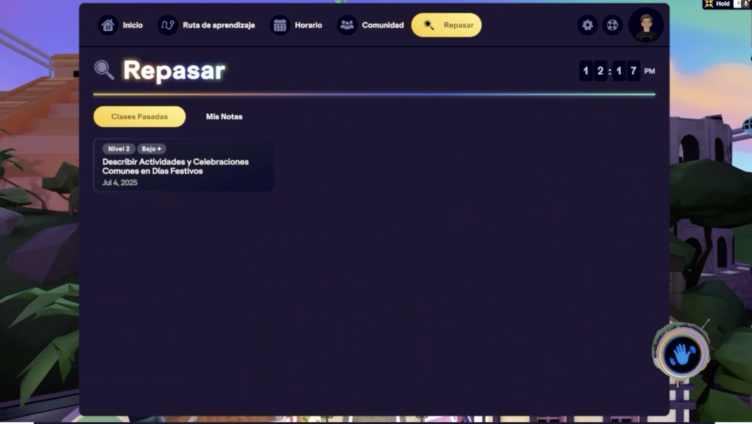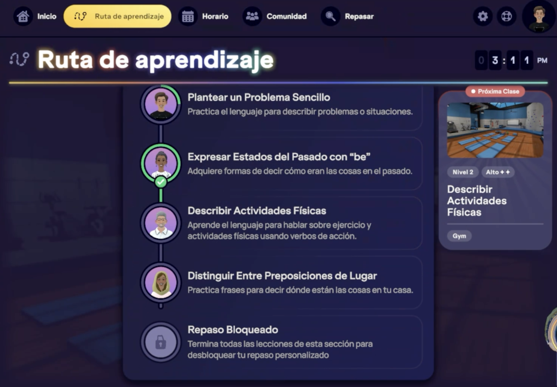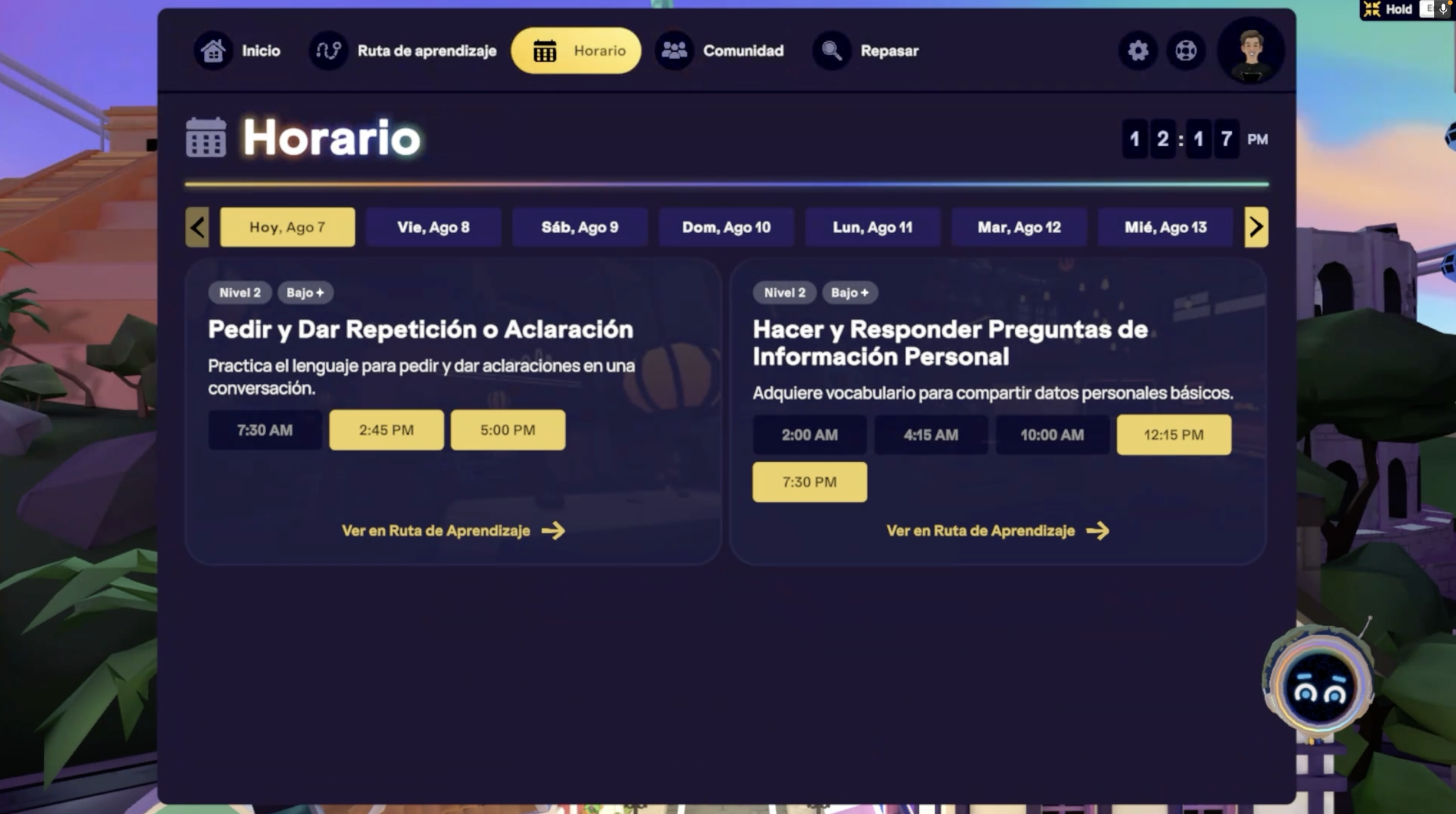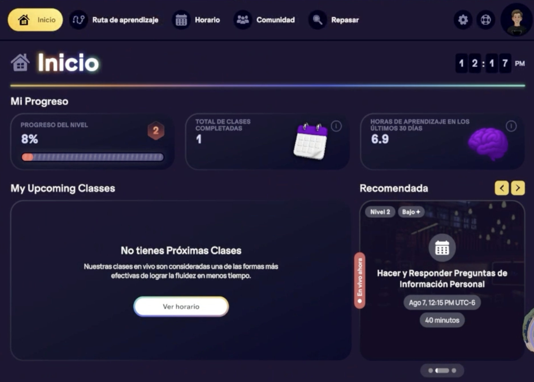 Solo verás clases correspondientes a tu nivel de fluidez en el horario de tu Homeroom. Para cambiar de nivel, ve a Configuración de Perfil.