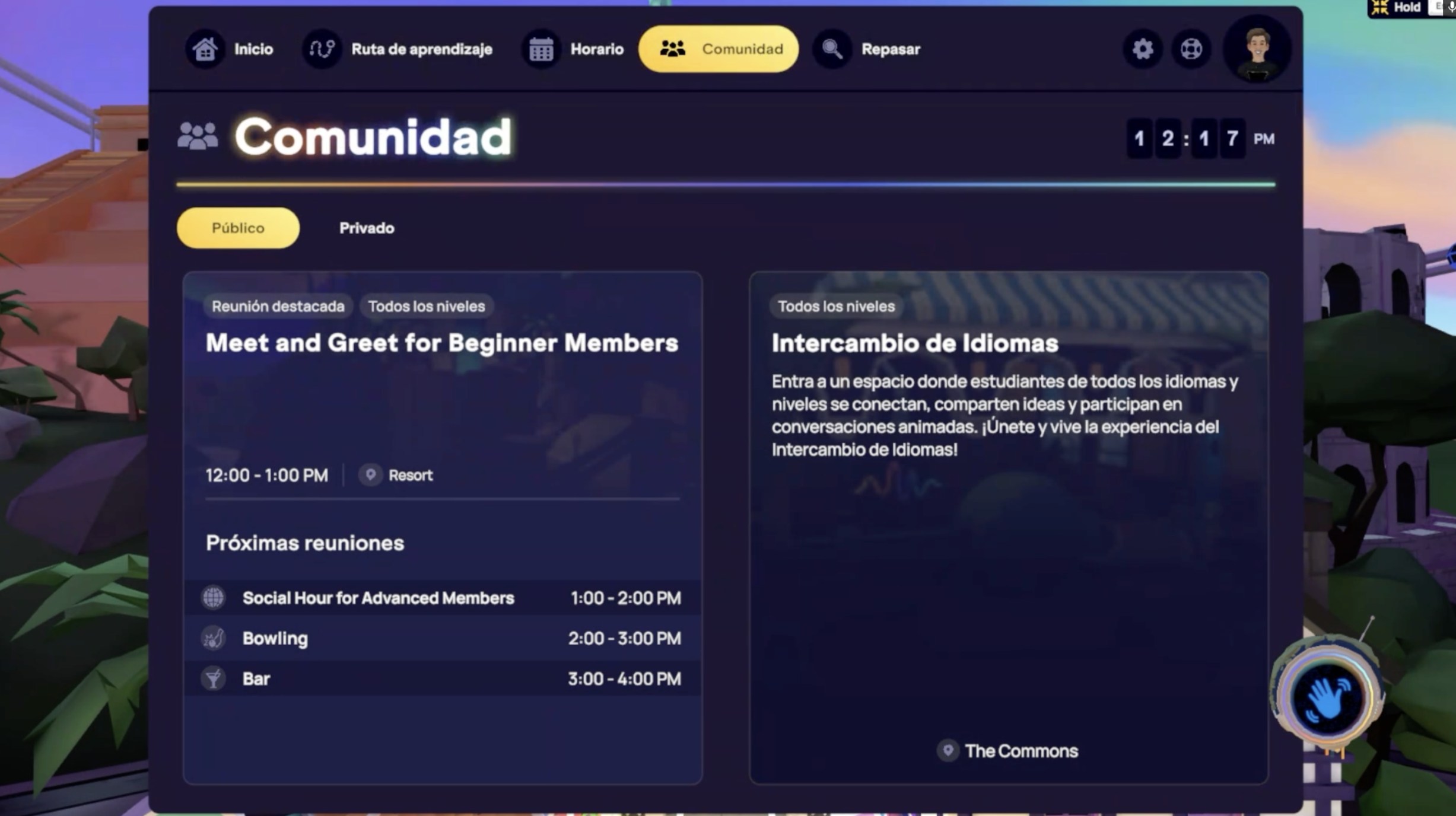 Los espacios públicos en IMMERSE son áreas comunitarias abiertas donde puedes interactuar con diferentes miembros de IMMERSE. Están diseñados para encuentros sociales, practicar el idioma con otros usuarios o con Avatares de IA, y explorar distintos entornos virtuales.