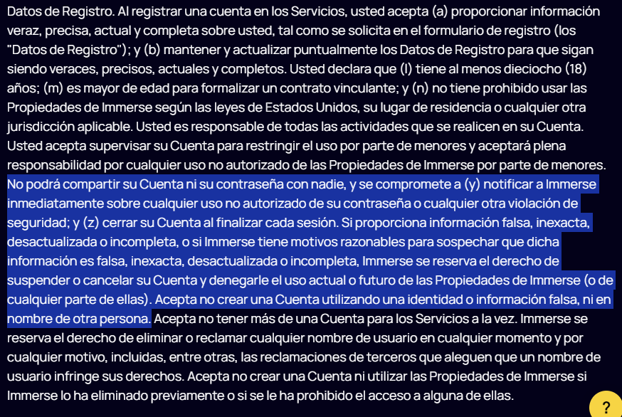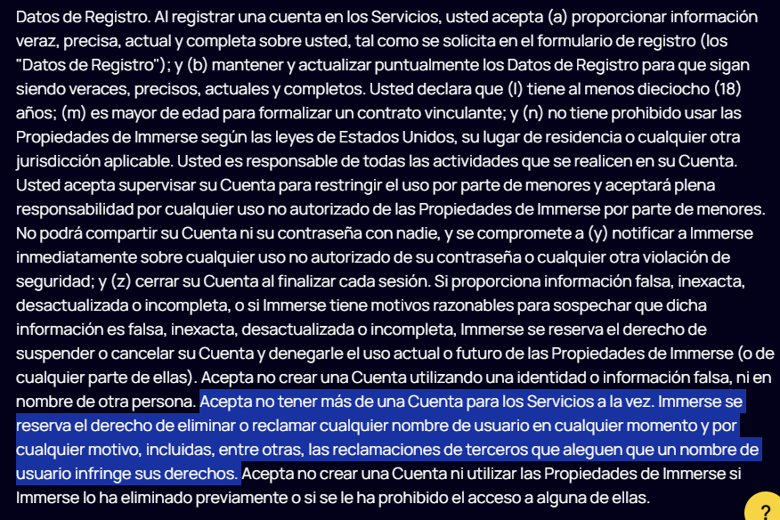 Al mantener tu cuenta personal, ayudas a garantizar una experiencia segura, justa y de alta calidad tanto para ti como para toda la comunidad de IMMERSE.