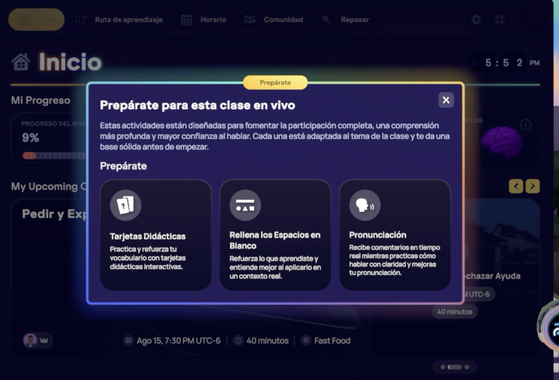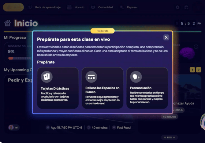 Cada objetivo de aprendizaje tiene un espacio de estudio asociado donde puedes practicar vocabulario, pronunciación y conversaciones relacionadas con el contenido de la lección, muchas veces para prepararte antes de una clase en vivo.
