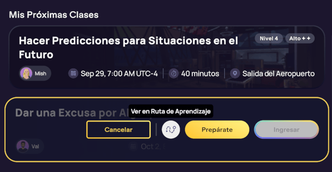 👩🏼🏫 Consejo del Guía: Haz clic en la opción “Ver en Ruta de Aprendizaje” al pasar el cursor sobre tus clases reservadas, para completar la Lección a tu Ritmo asociada como práctica antes de entrar a la clase en vivo. ¡Estas lecciones también son excelentes para repasar después!