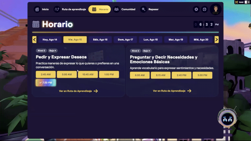 Antes esto era necesario, ¡pero en nuestra actualización más reciente de septiembre de 2025 eliminamos este requisito! Ahora puedes acceder a todas las actividades preparatorias de cualquier clase reservada, sin importar el nivel que tenga tu cuenta. Ten en cuenta que aún necesitarás cambiar a ese nivel para ver tu clase reservada en la Ruta de Aprendizaje o en el Horario.