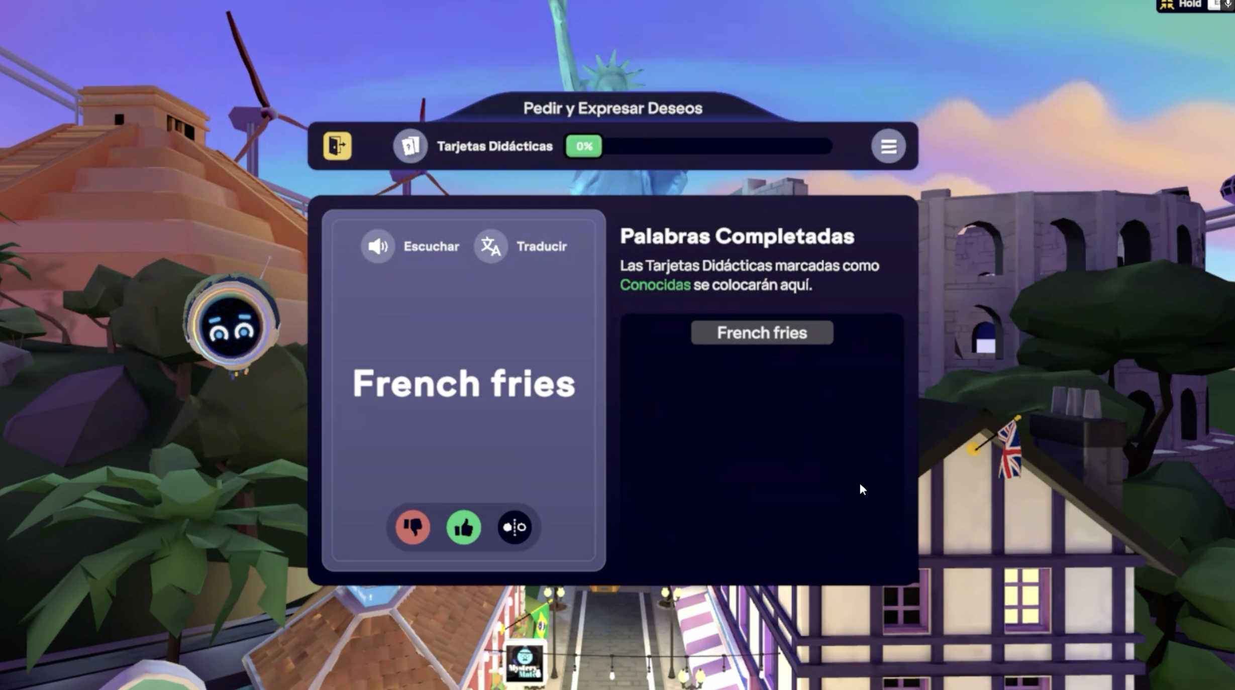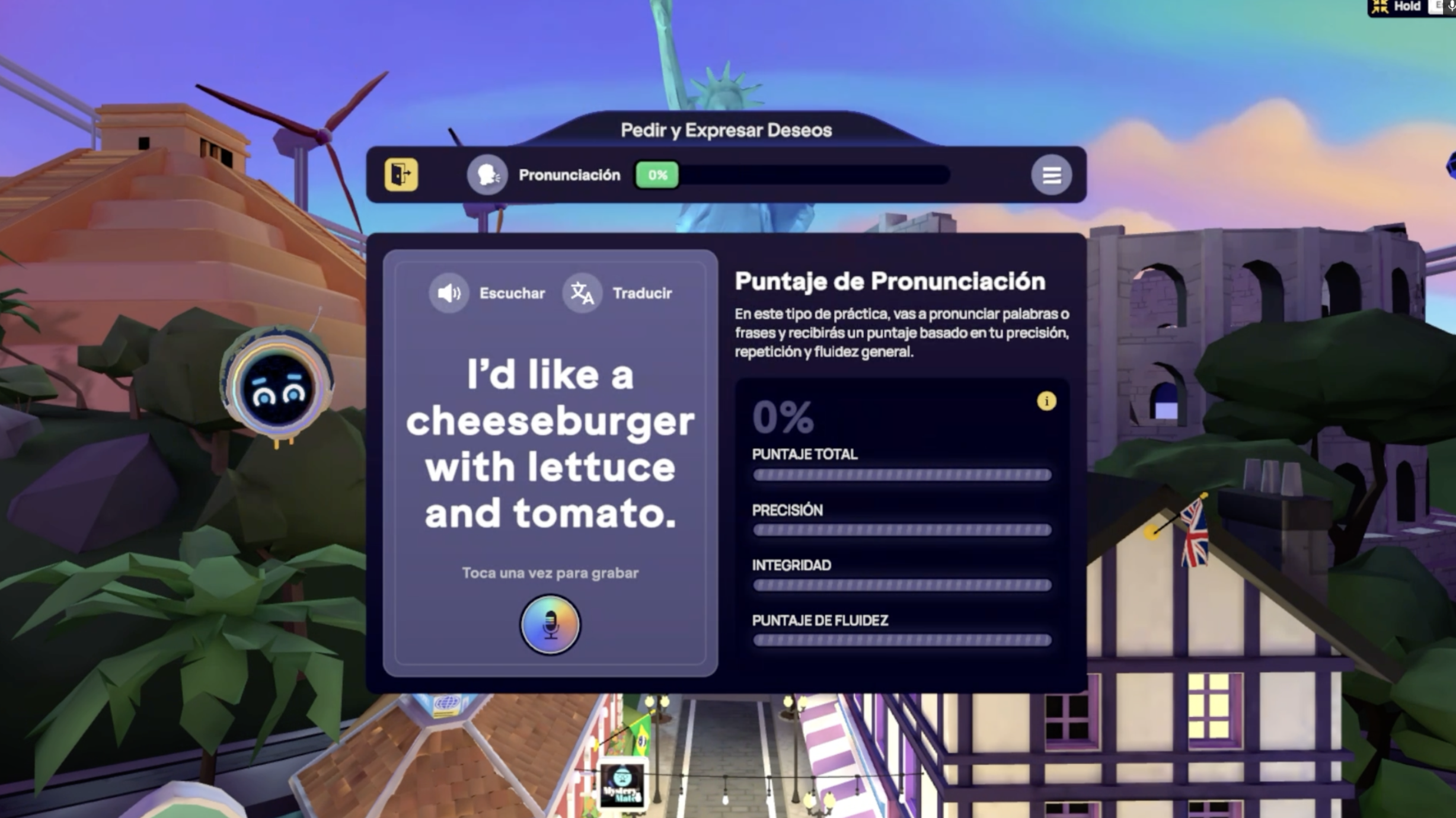 Puedes hablar con el avatar de práctica en cualquier idioma, y el cuadro de diálogo traducirá automáticamente tus palabras.