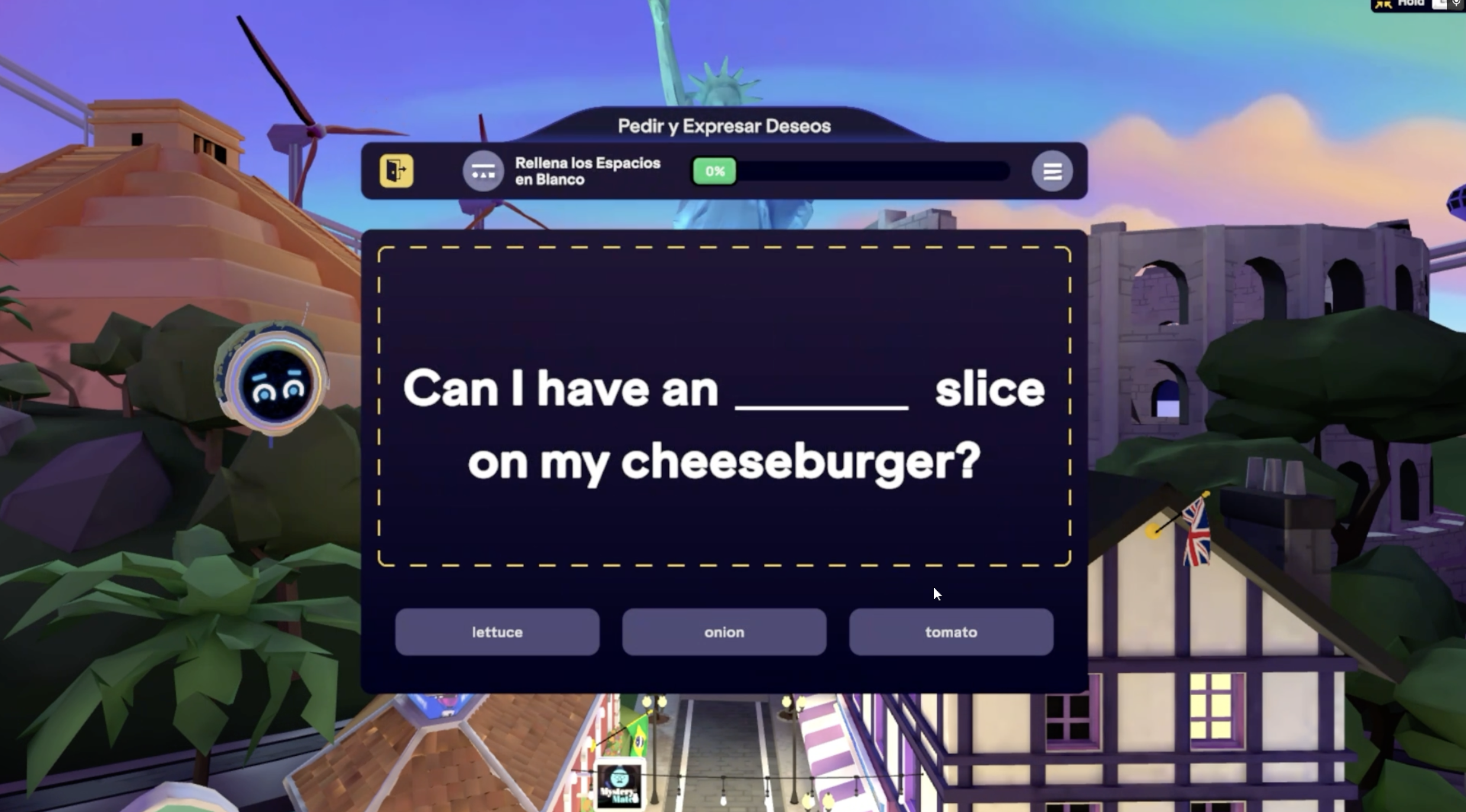 Esta actividad te evalúa sobre nuevas palabras y frases mostrando oraciones con una palabra faltante y tres opciones para elegir.