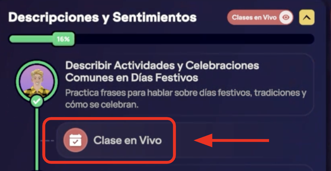 Las clases presenciales completadas después del 30 de junio de 2025 ya no harán que el indicador de "Lección a tu propio ritmo" se vuelva azul. En su lugar, al activar "Clases presenciales" en la Ruta de aprendizaje, estas aparecerán con una marca de verificación roja junto a ellas. Para avanzar de nivel, deberás completar la Lección a tu propio ritmo correspondiente, ya que las clases presenciales tomadas después del 30 de junio de 2025 no contribuyen al progreso de nivel.
